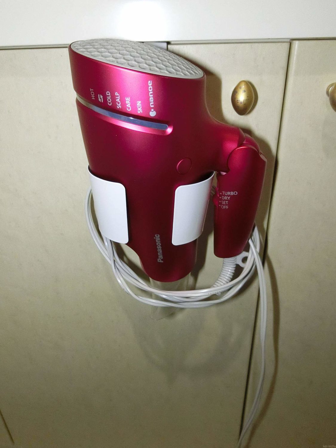 そして、内カゴの外側に小さめのフックを付けてやると、スーパーの袋などをひっかけて固定できるので、おすすめです。