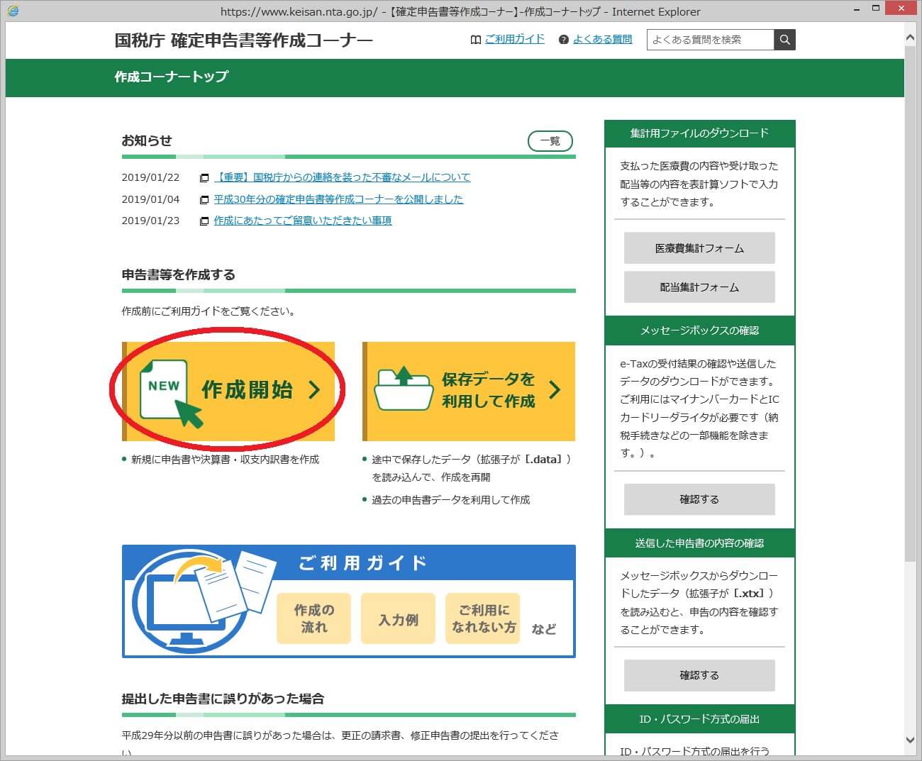 - 確定申告書等作成コーナーに移動し、「作成開始」をクリック