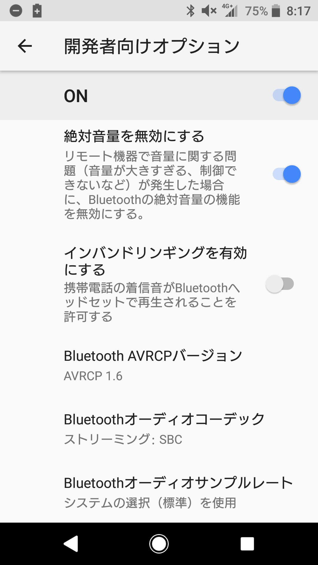 そこで、この微妙な音量感を無くすべくBluetoothの絶対音量を無効にして対応しました。