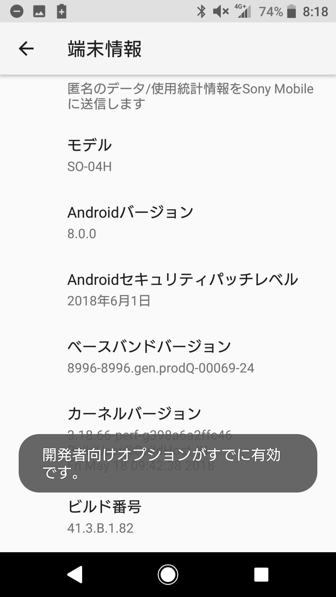 ビルド番号を7回連打すると開発者オプションが表示されるようになります。