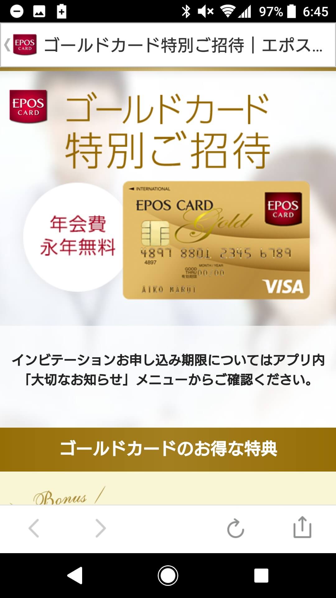 エポスカードゴールドのインビテーション到着!