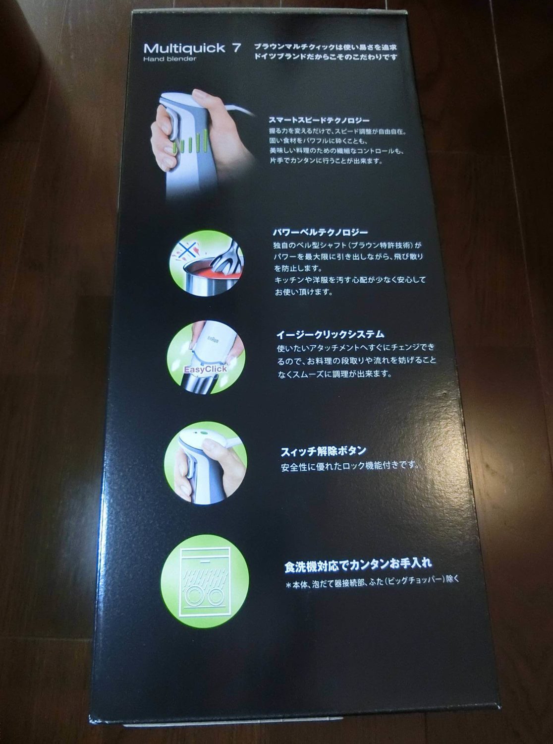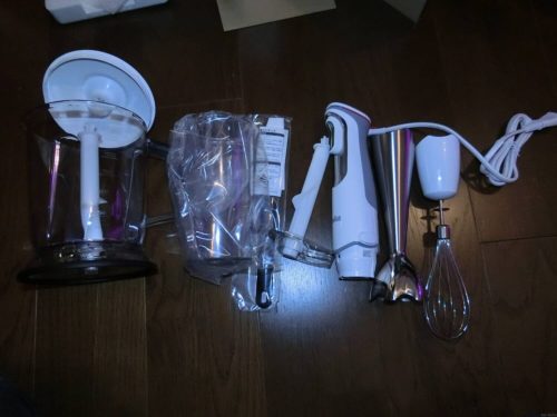 我が家で購入したのは日本で市販されているもののうち、ブラウン ハンドブレンダー マルチクイック MQ745にしました。機能としては「混ぜる」「つぶす」「きざむ」「砕く」「泡立てる」の5役を担えるブレンダーです。もう一つ上位機種もありますが、こちらはスパイスチョッパーが付いており魅力的でしたが、在庫がなかったので、(使用頻度が著しく低そうな)スパイスチョッパーはあきらめてこちらにしました。