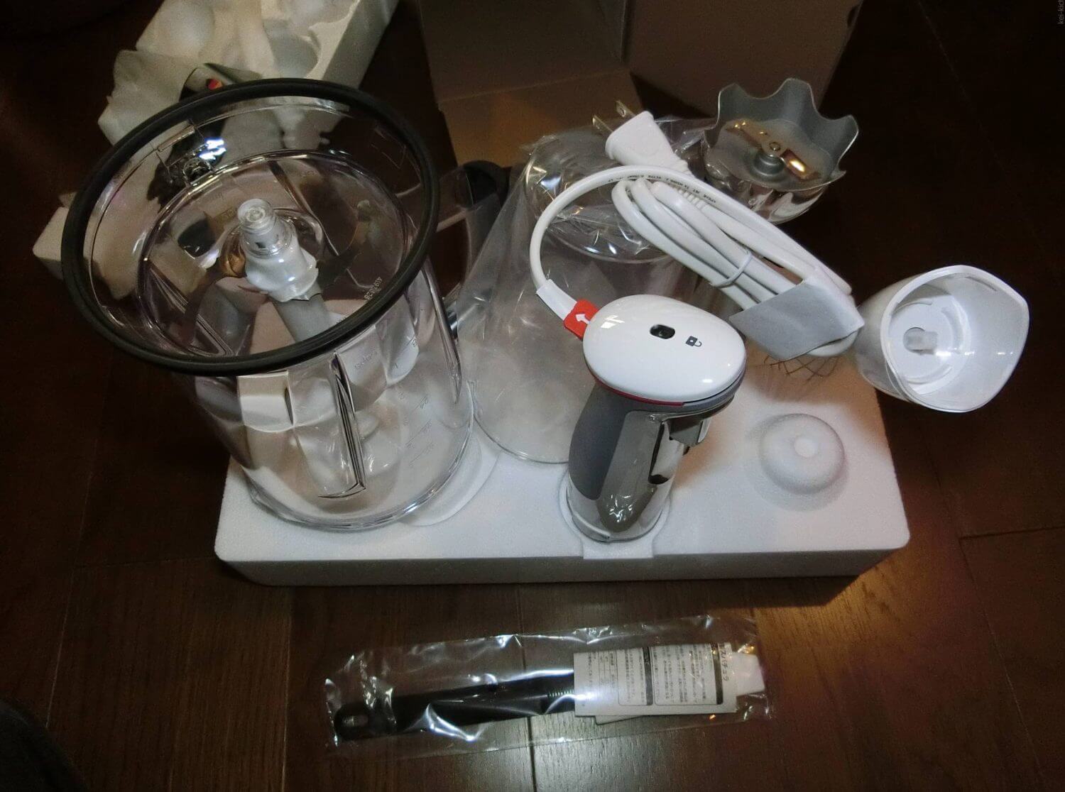セット内容・付属品:本体(モーター部分)、ブレンダーシャフト、泡立て器、ビッグチョッパー、アイス用カッター、専用計量カップ、専用スパチュラ