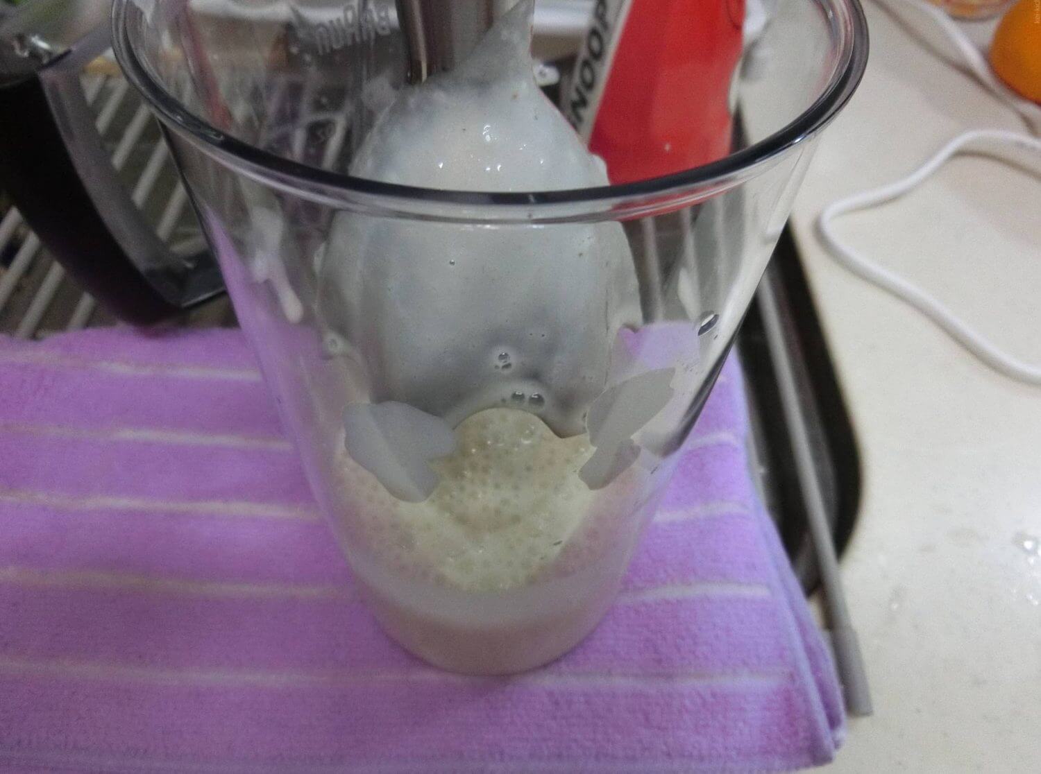 思ったよりもブレンダーの先を動かさないと混ざらないのですね。初心者の意見ですが、この辺がスイッチ一つで勝手に混ざってる通常のミキサーと異なるところでしょうか。でも、かなり便利で、かなり気軽に楽ちんにミックスジュースが作れるのは良いですね。