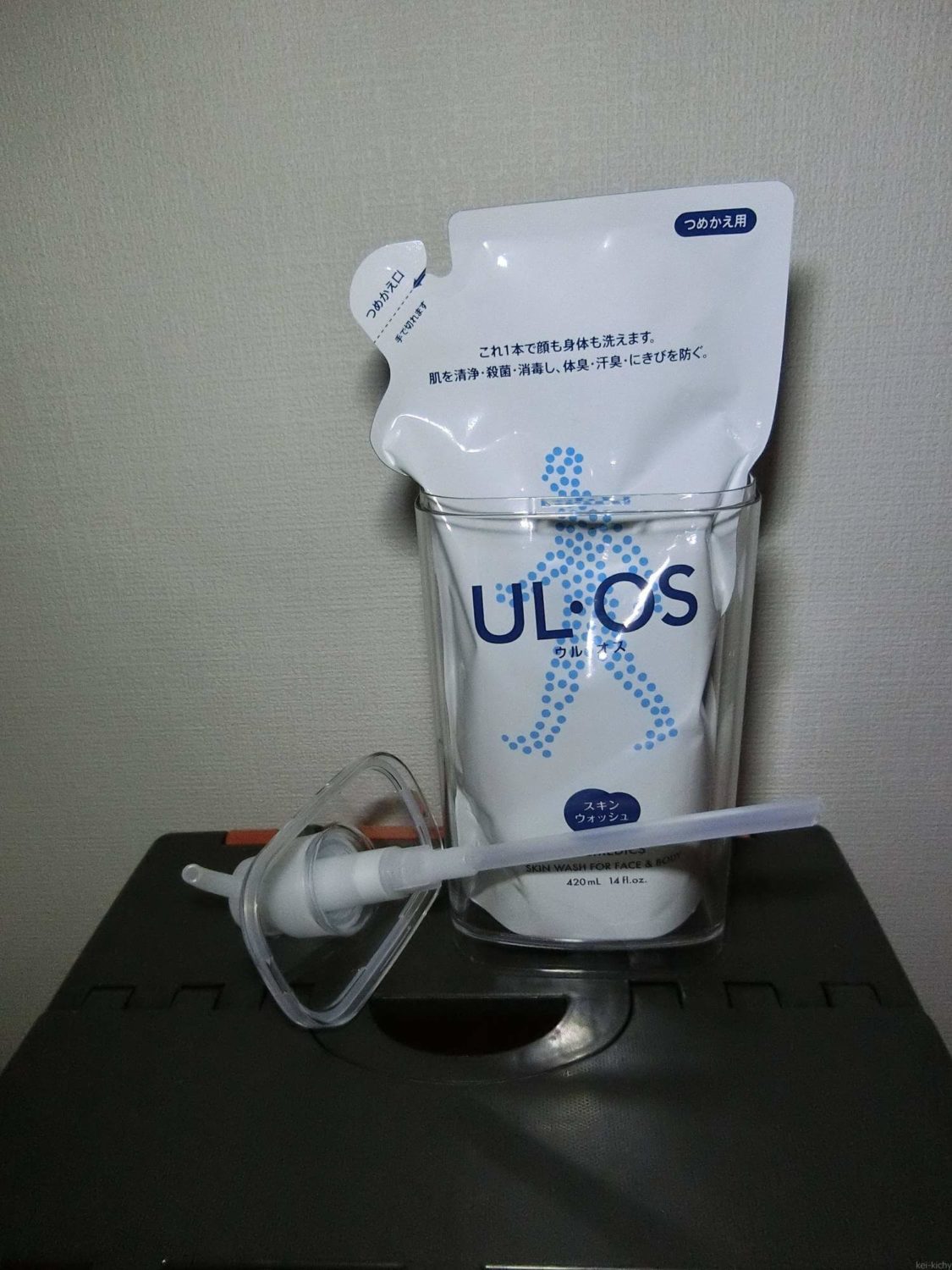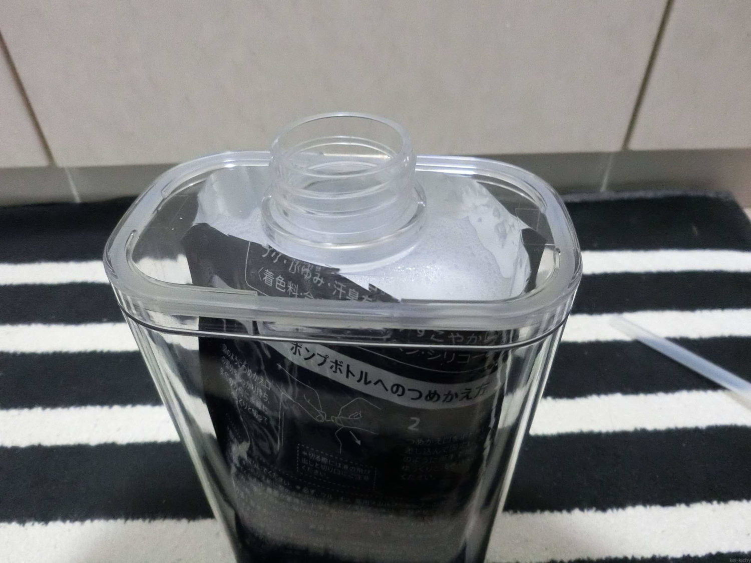 スタイリッシュで良いですよね。大きく蓋も外せるので掃除もしやすく、乾燥もさせやすいので衛生的です。さらに、今回はこれに市販の詰め替えパックをぶち込んでしまいます。