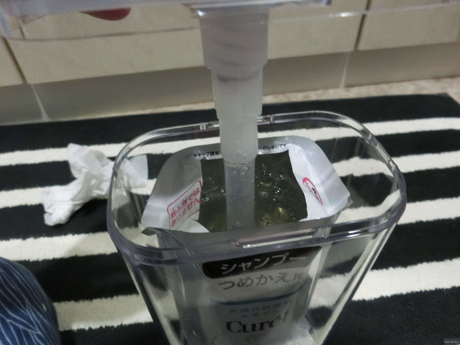 検索しても出てきませんでしたので、Curelの詰め替えにポンプ差し込んで試してみました。誰かが人柱にならないといけないのです。