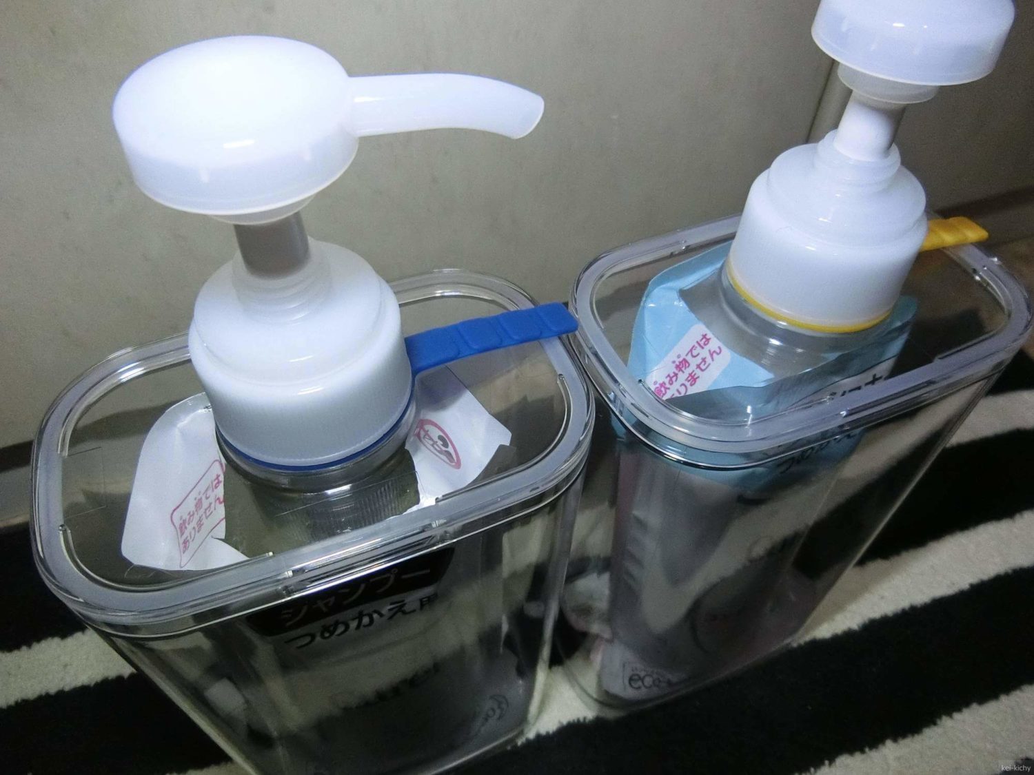 このセットの仕方が最適なのかはわかりませんが、切るのが面倒だなと思うのと、切った後のはさみやカッターの掃除が面倒ということがよくわかりました。無印の容器は何個か購入しているのでボディーソープなどは詰め替えの口からホースを刺してみるのも少し考えようと思います。