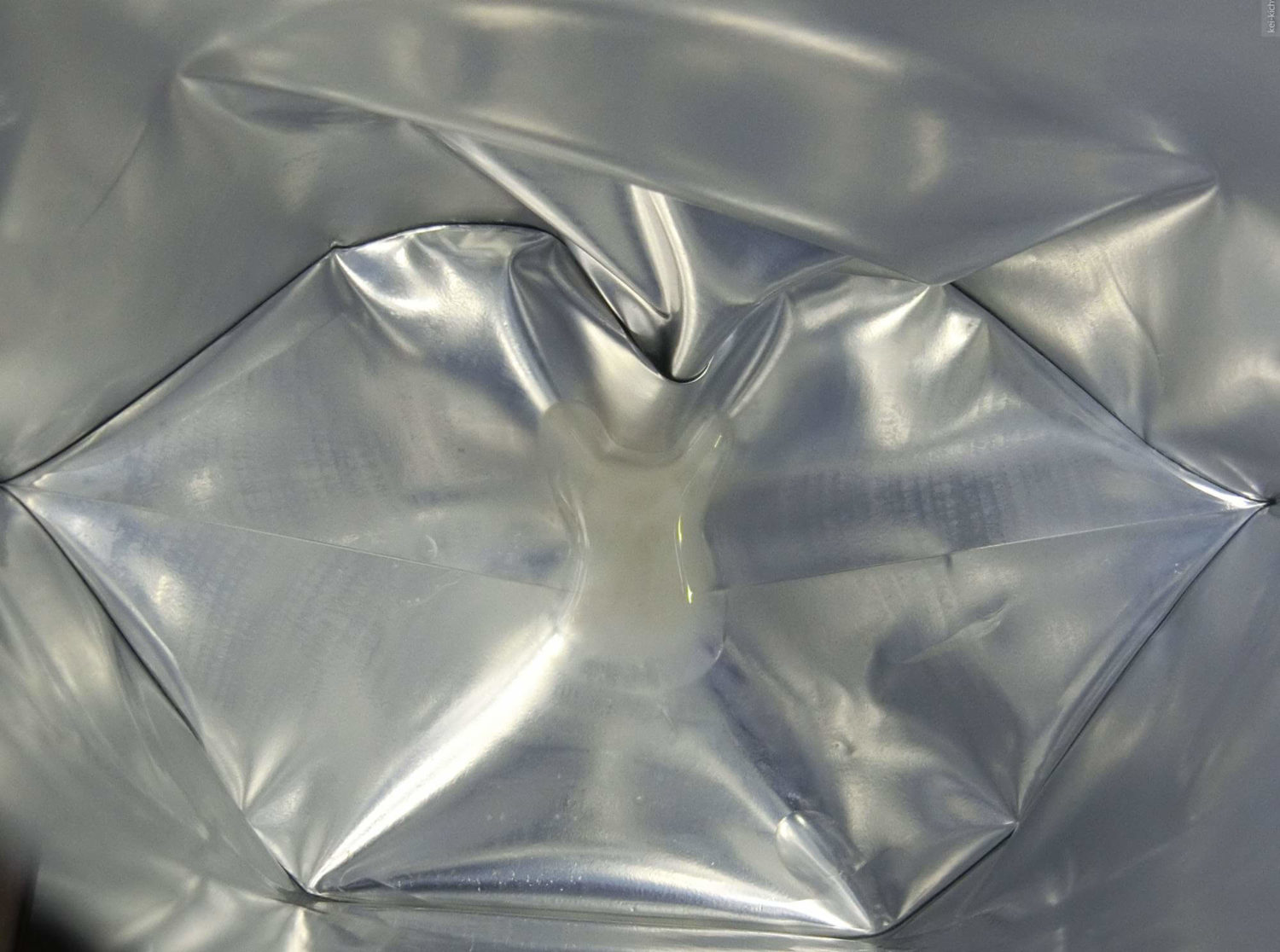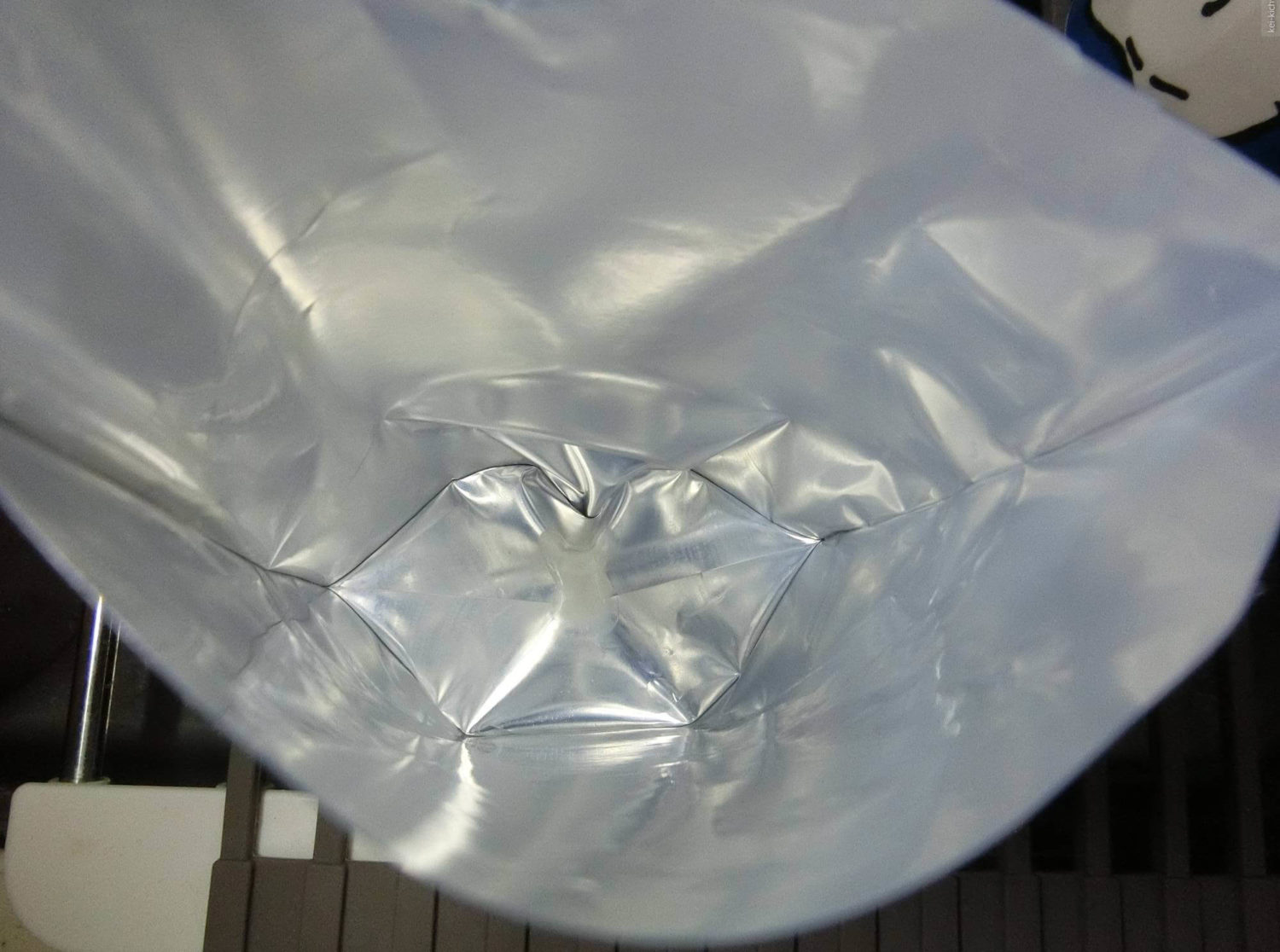 パウチの足の部分を少しカットします。パウチの融着している部分を切れば中身は出ません。見た目でどこまで切っても大丈夫かわかるかと思いますが、無理しない方が賢明です。漏れれば意味ないですから。。。