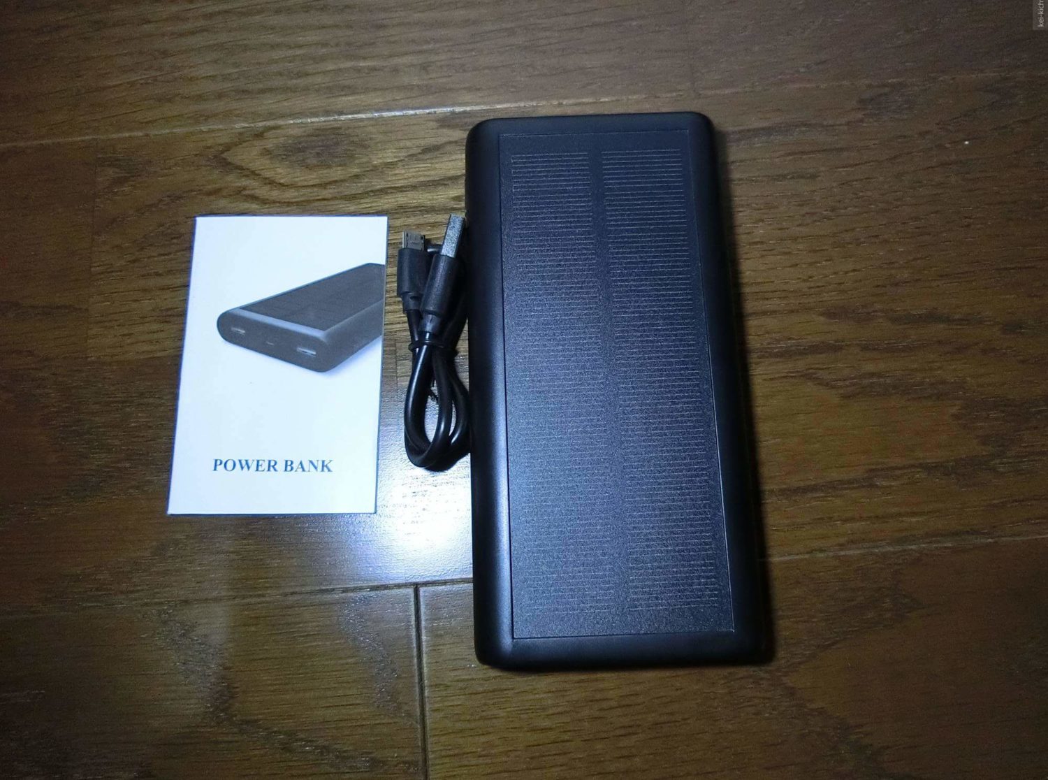タイトルはTHE中華で例のごとく「2020年最新版 モバイルバッテリー ソーラー 26800mAh ソーラーチャージャー 大容量 ソーラー充電器 急速充電 2USB出力ポート 地震/災害/旅行/出張/アウトドア活動など iPhone/iPad/Android各種対応」といった感じ。この名前の付け方品がなくて本当に嫌いです笑。