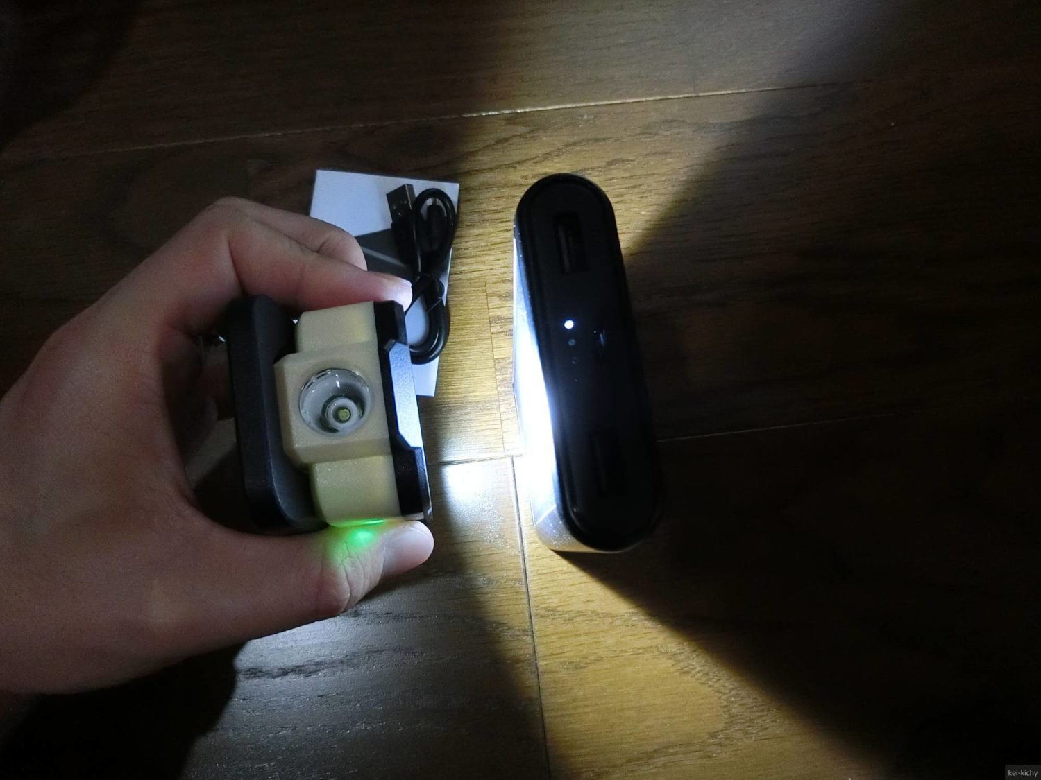 このように充電し始めます。この時は届いた直後だったので、電池残量はほぼ空なので、点滅は1個のみ。充電が進むと1個目が点灯、2個目が点滅、といったように点灯するLEDが増えていきます。ただ、こんな小さな太陽光パネルなので、発電量も限られており直射日光での充電で160時間必要とのこと。災害時にありがたいかも…?といったぐらいですね。