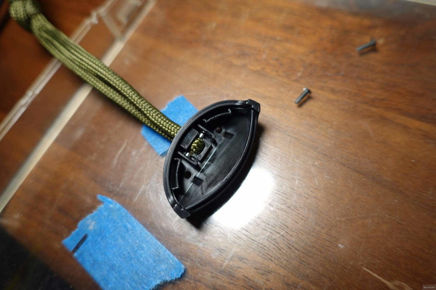 これで非常に丈夫なストラップがシューティンググリップに装着されました。こんな感じで小さければ金属製のリングやチェーンも付けれたりするかもしれません。