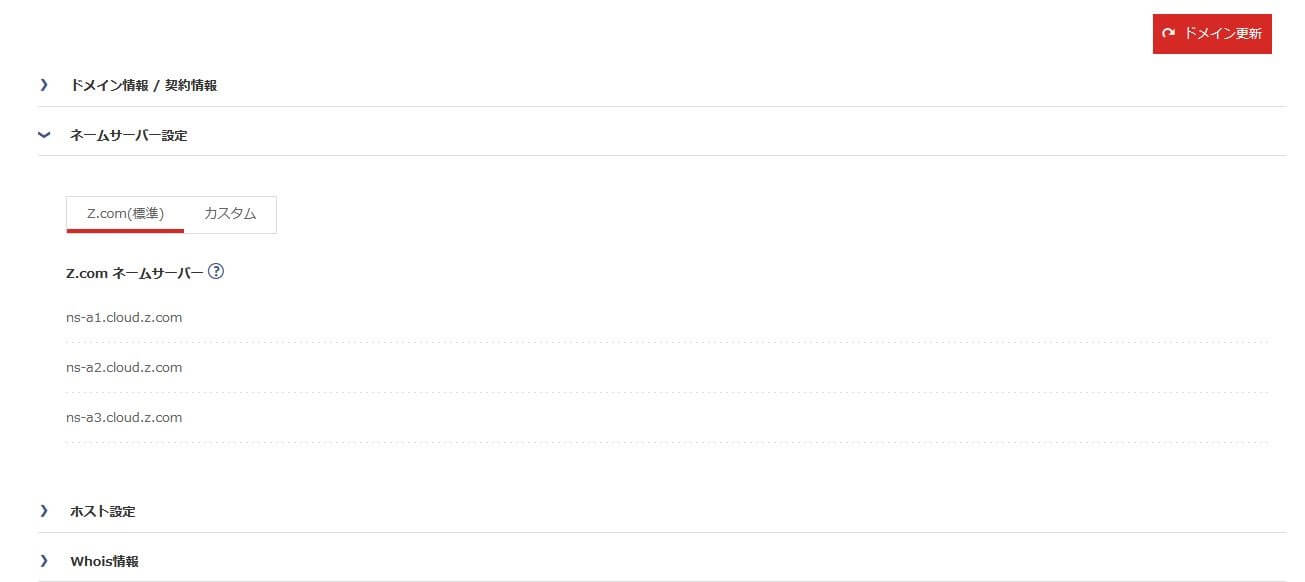 設定したいドメインを選択し、ネームサーバー設定でZ.comのネームサーバーを選択します。Z.comのDNSを設定しない場合は、使用するDNSの管理画面から設定する必要があります。今回の場合、Z.comのDNSを使用し、一部をLolipopのDNSに割り当てます。