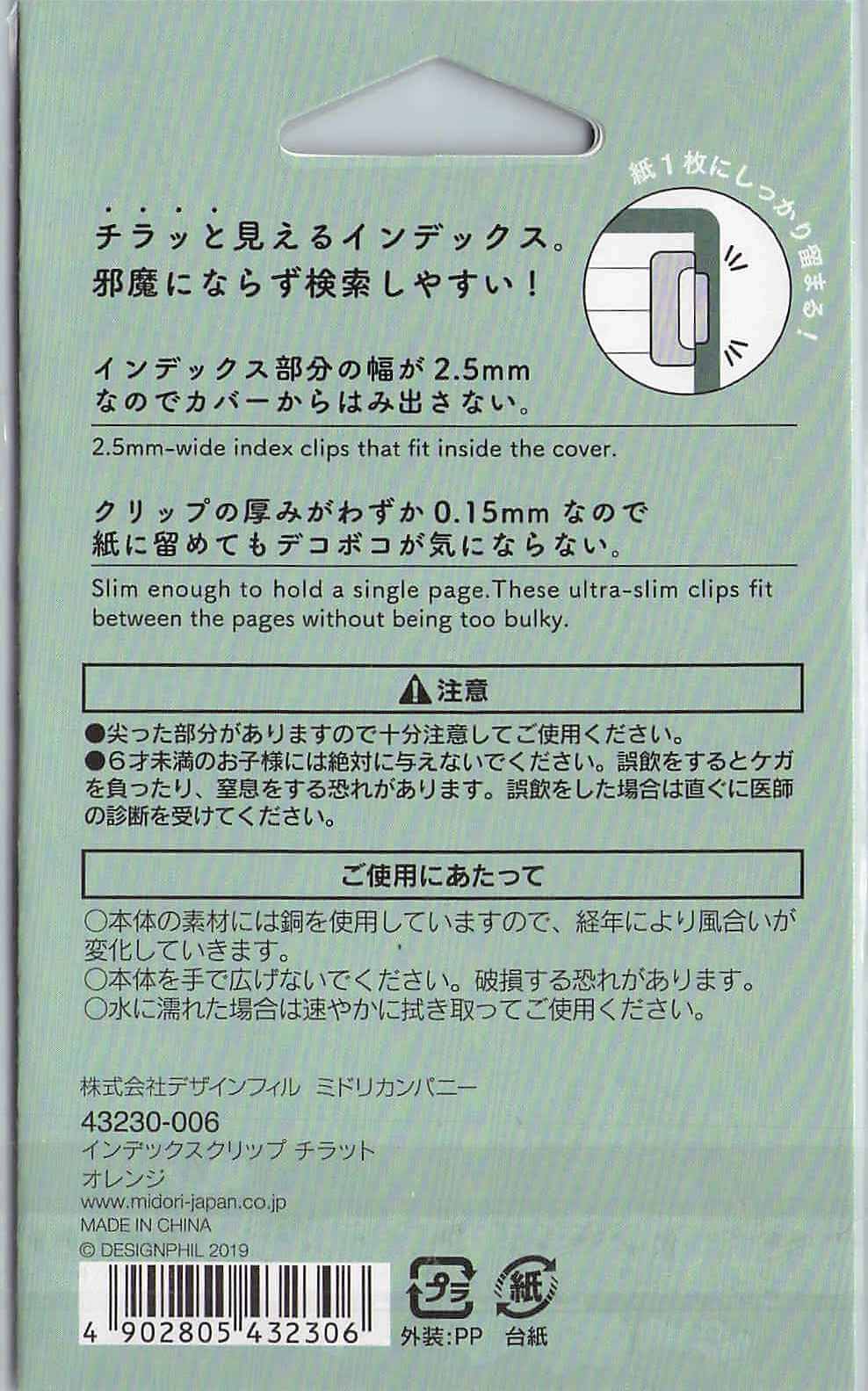 本体の大きさも高さ21×幅12.5×厚み0.5mmとかなり小さいので、手帳にセットしても膨れませんし、付け替えも簡単です。出っ張り部分は2.5mmと小さいので、手帳の内側に収まりますが、手で引っ掛けて開くのには十分な出っ張り具合でした。