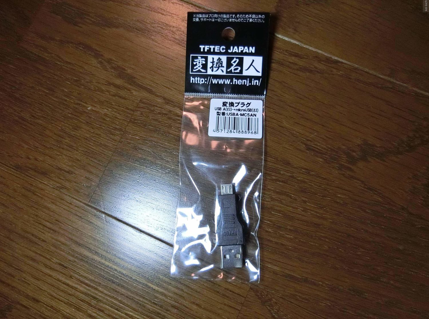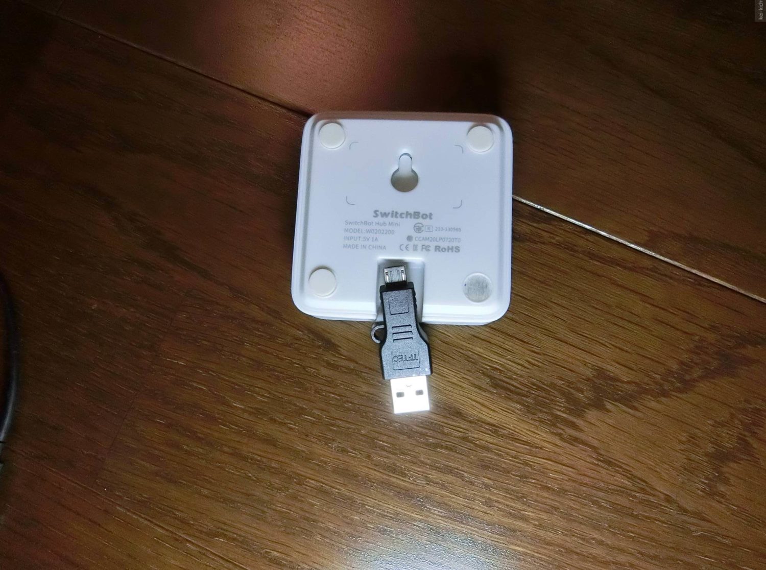 変換名人というブランドの品番がUSBA-MC5ANというものが安くて直付けで良い感じです。ポイントは「適度なmicroUSB側の首の長さ」です。SwitchBotを持っている人は分かると思いますが、USBポートが本体の奥まったところに存在しています。なので、短いタイプの変換器を用いると届かないという非常に悲しい事態に陥ります。