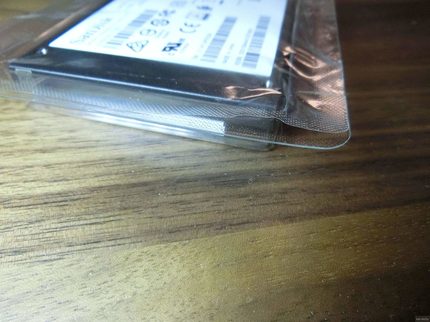 話が変わりますが、SSDのパッケージ状態が良くないのが気になりました。。。おそらく、元々フィルムの融着が甘かったので、輸送時の振動や、保管時の気温変化などで剥がれてきたのでしょう。SSDが取り出せる程度までフィルムが空いていたので、端子部などをしっかり確認しましたが、使用痕はなく返品品ではなさそうなので、気にせず使っていくことにします。