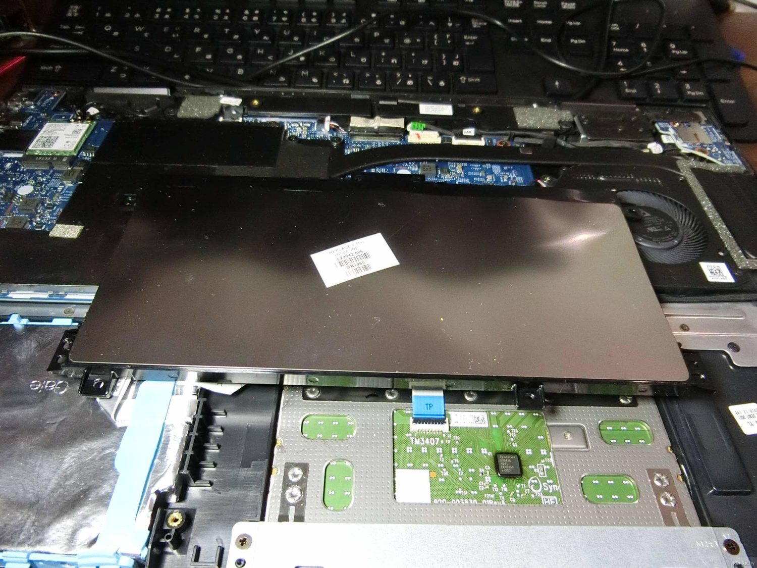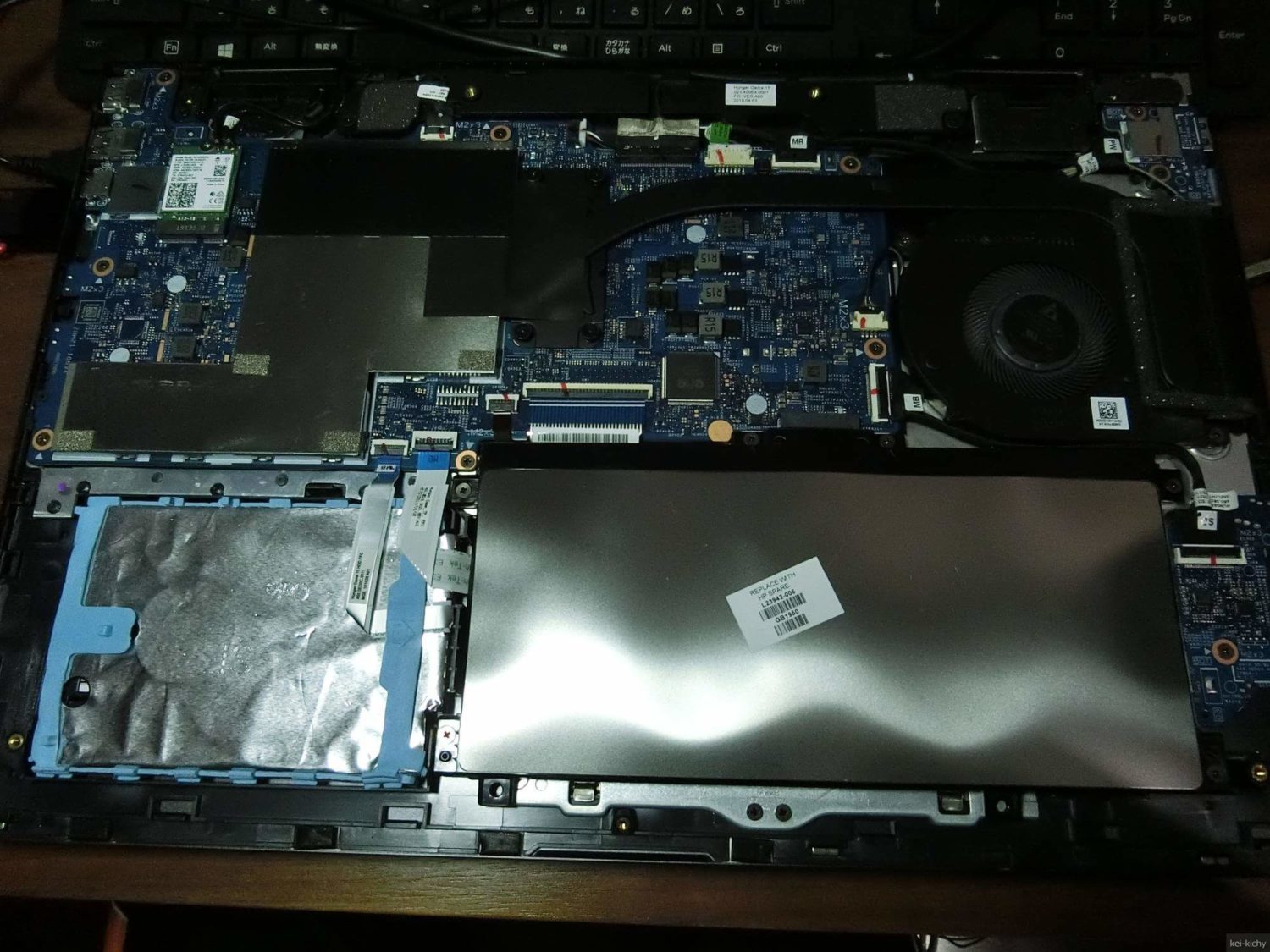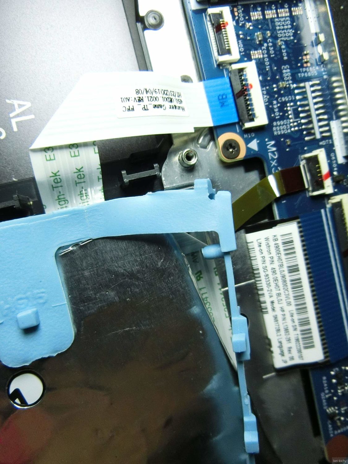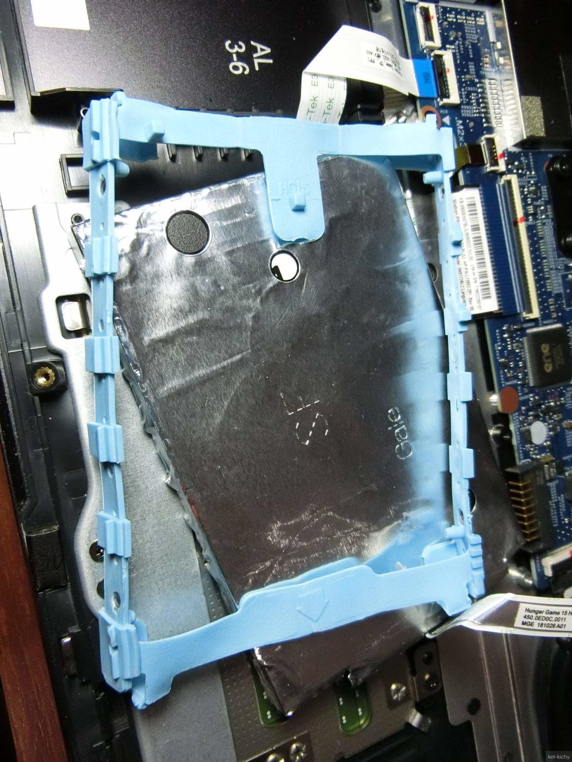 バッテリーの左側の青いゴムに覆われているのがHDDです。HDDとマザーボードはフラットケーブルで接続されています。引っ張ったりして切断しないように気を付けて作業しましょう。冬場の作業の場合、部屋の湿度を上げるなどの帯電防止策を取るようにしてください。