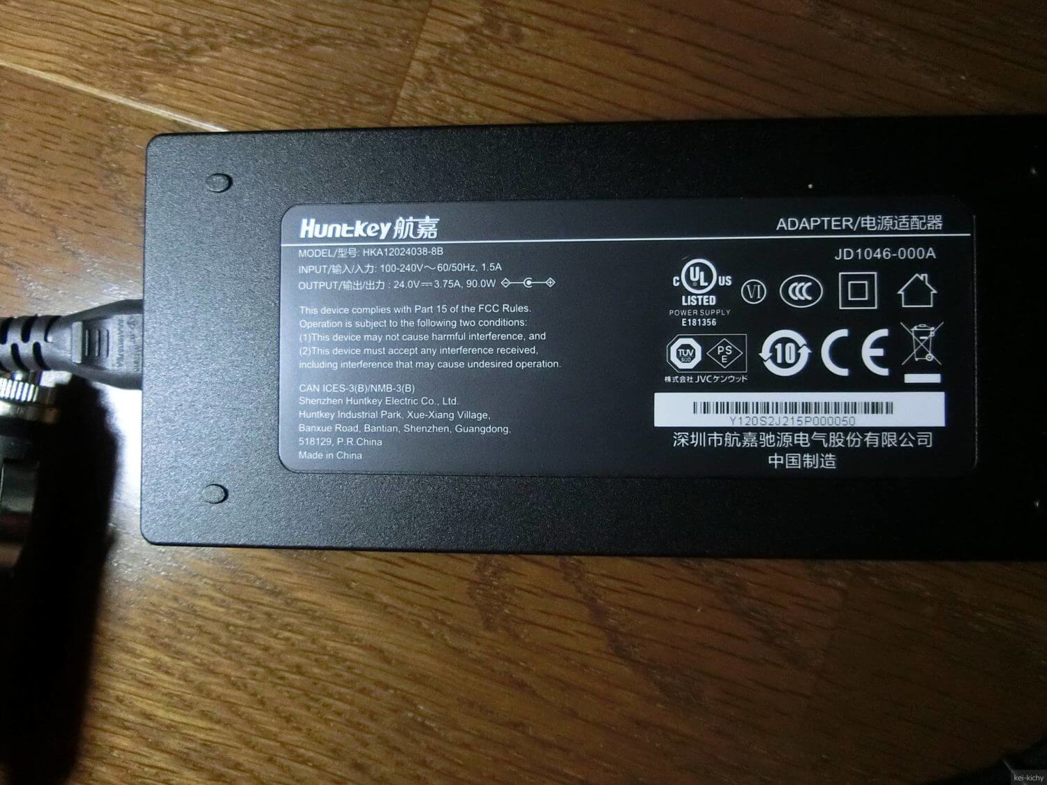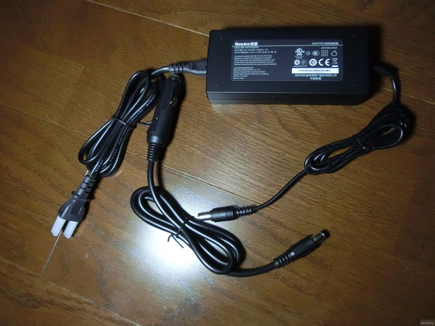 付属の充電器(品番:HKA12024038-8B)は、ACアダプターは出力DC24V3.75A(90W)のものでした。さすがに大型のACアダプタが付属していました。スーパーで売っているコンニャクぐらいのサイズがあり、なかなか圧迫感があります。