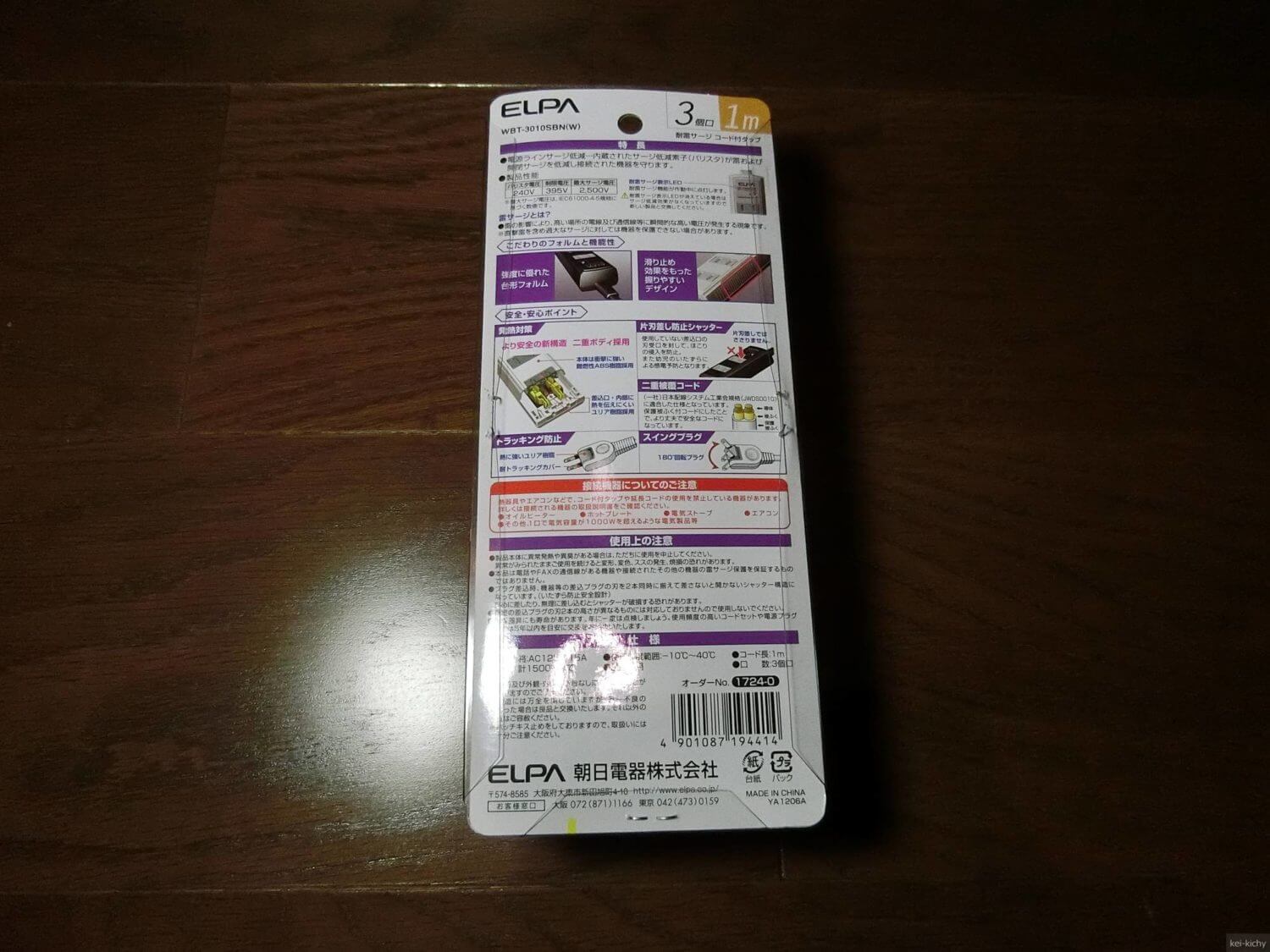 3. ELPA 耐雷サージ機能付コード付タップ 3個口 1m