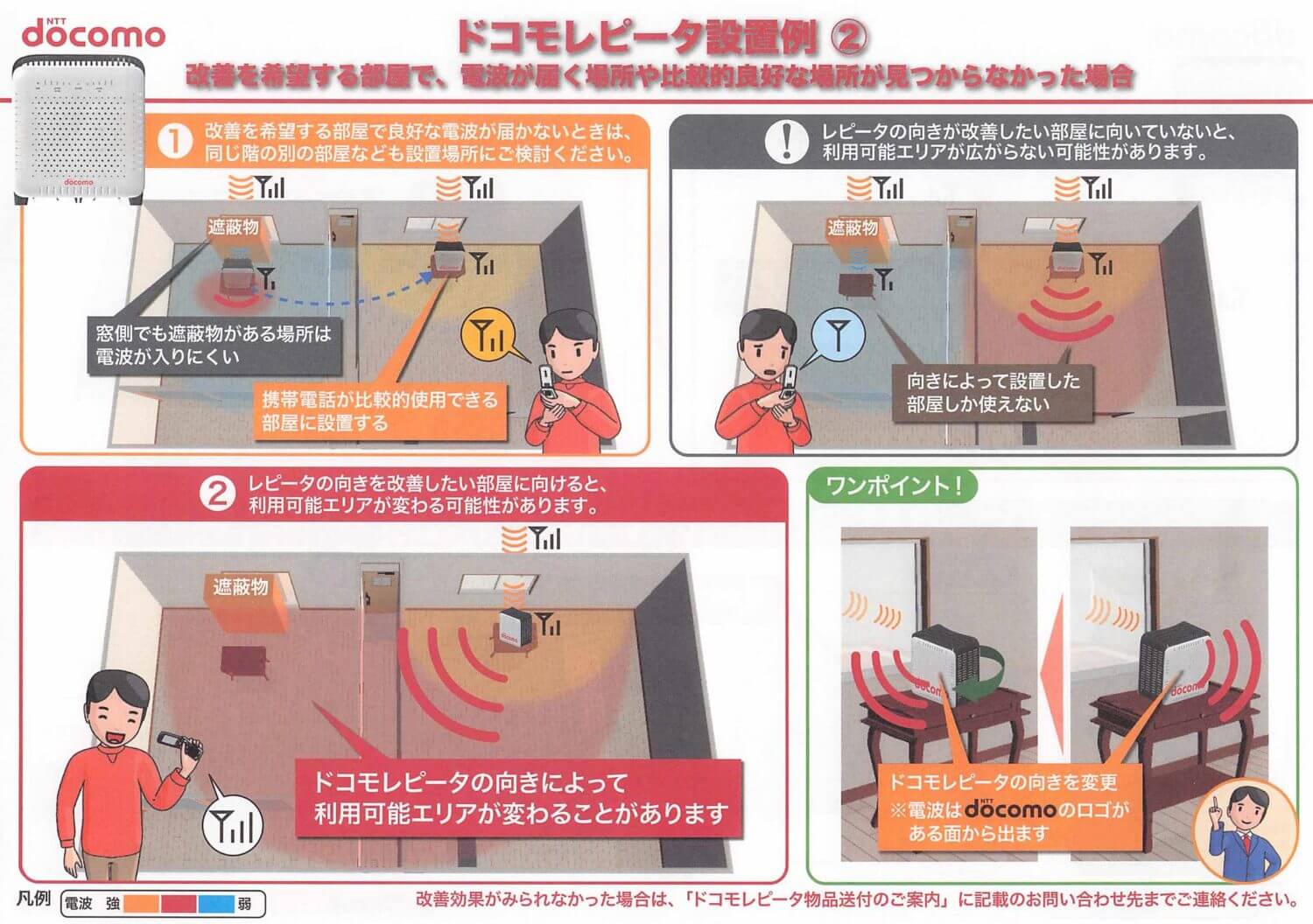 レピーターというのは単なる増幅器で、増幅した電波を放出する方向も決まっているので、設置場所や設置高さ、方向などによって全く状況が変わることがあるので注意が必要です。設置したけど、全く効果が薄かったり全く無かったり、ということも想定されます。