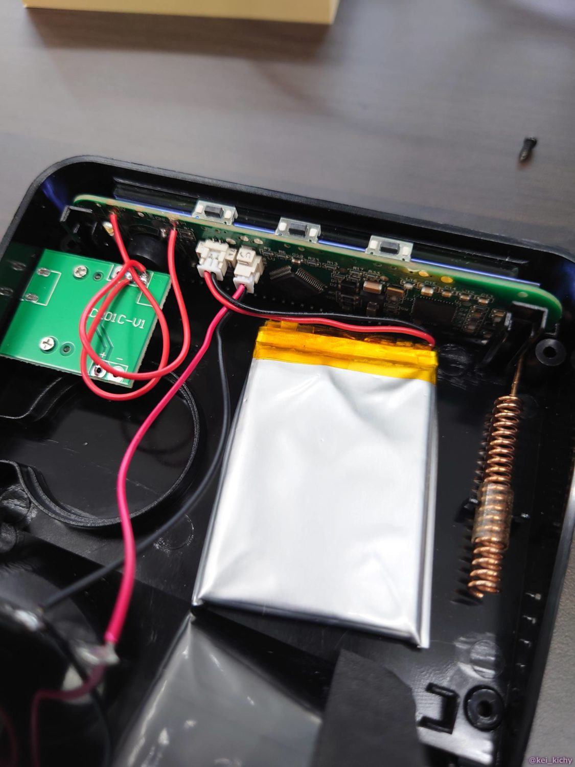 ちなみに起動時のピッという音がうるさければ、USBポートのある基板とメインの基盤の間に挟まっている黒い円柱の部品の穴を塞ぐようにテープを貼れば音が軽減します。ただし、あまりにしっかりと穴に封をすると低圧アラームが聞こえませんので、注意が必要ですね。