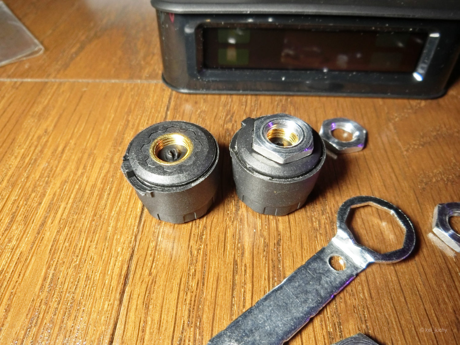 センサーはタイヤにセットしてダブルナットにして脱落を防止します。センサー部が緩むと空気も漏れますので、確実に固定しておきたいものですね。ちなみにナットはアルミ製っぽいので、寿命に関しては。。。という疑問符が付きます。タイヤのバルブのネジ径とピッチは調べればすぐに出ますので、ステンレスのに変えてしまうのも手ですね。