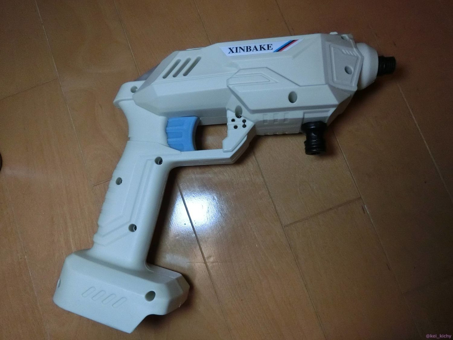 白いデザインで格好いいですが、オモチャ感があるのが気になるところ。ガンのホースコネクタが弱そうと思っていましたが、この後ここから破断して大変なことになります。。。
