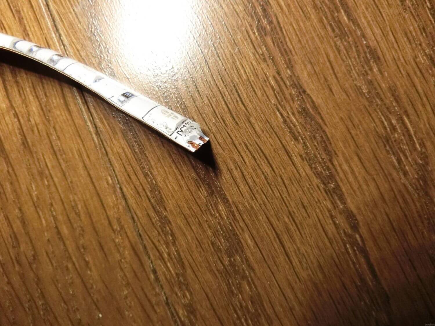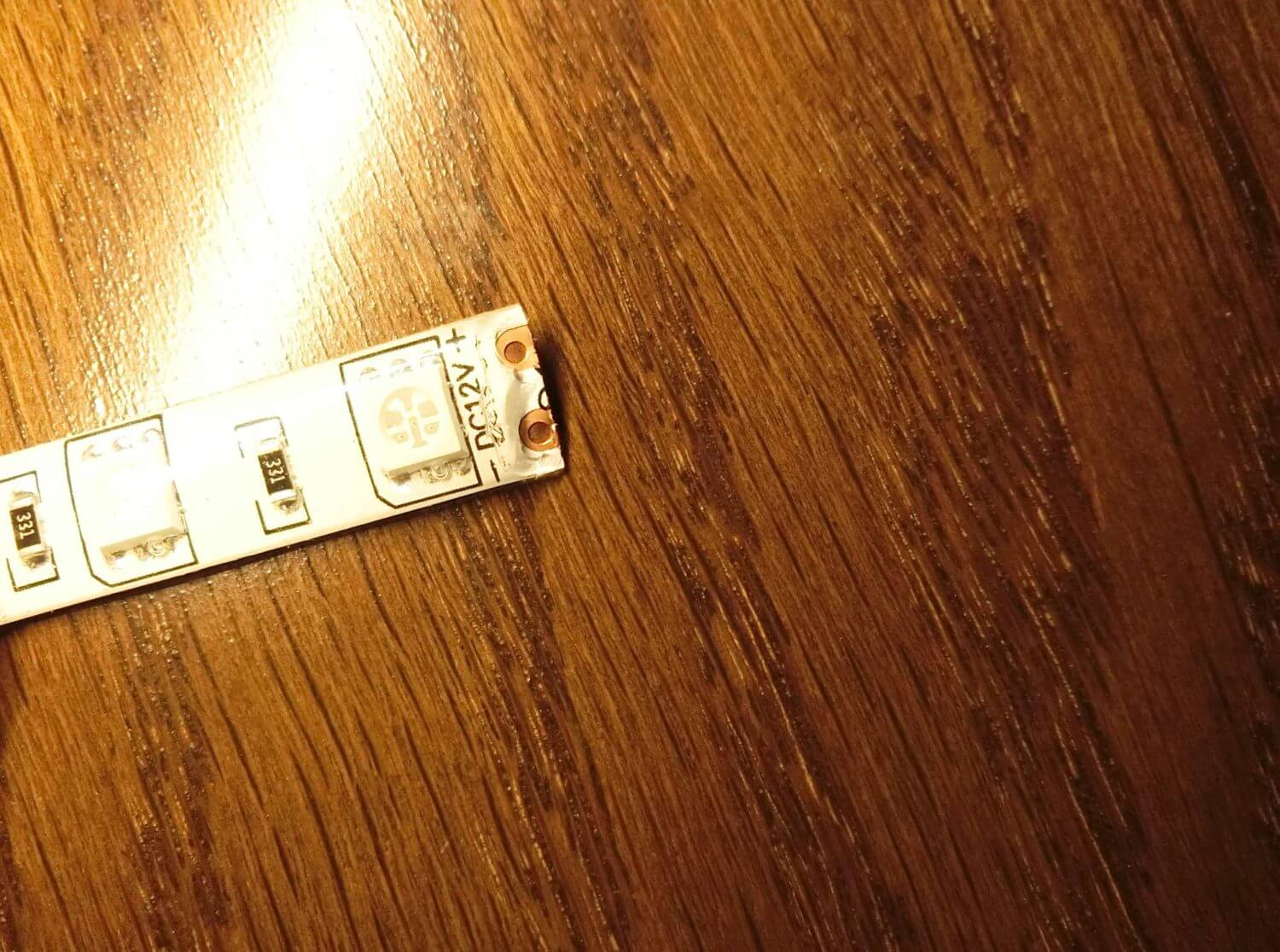 そして、このLEDテープの配線ですが、防水タイプを購入しているので透明な樹脂で保護されています。これを頑張って剥がして接点を露出させます。