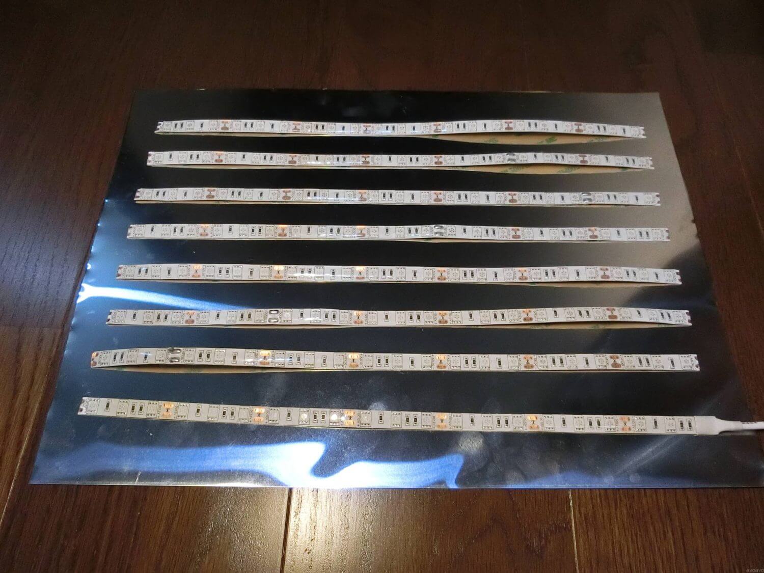 サイズに合わせてLEDテープをカットして並べます。この際、導線でどのようにつなぐかを考慮して、LEDテープ