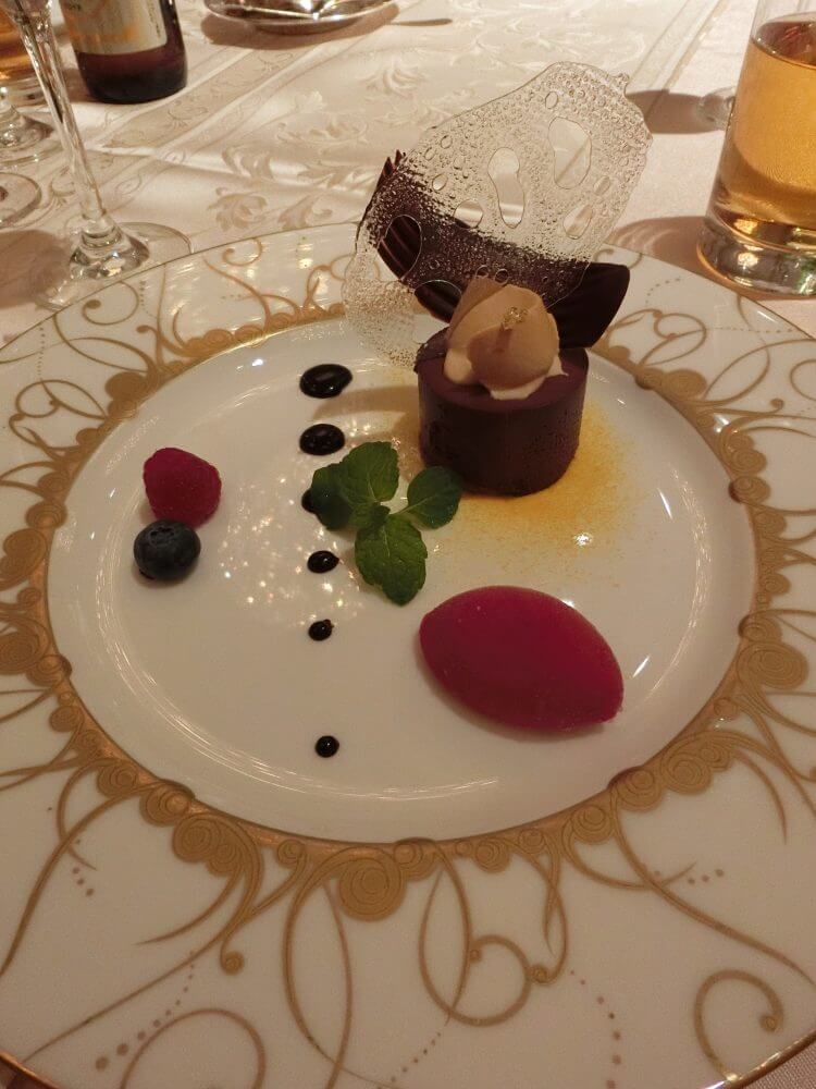 キャラメルクリームを添えたビターチョコレートのムース フランポワズのソルベ