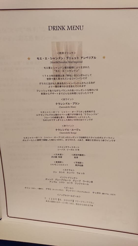 1名/\10,800円(税込み、食べ物飲み物とすべてのサービス料込)