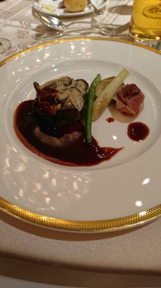 フィレビーフはやっぱりうまい!赤ワインソースもおいしいですが、上に載っているキノコのクリーム煮も良いアクセントでした。