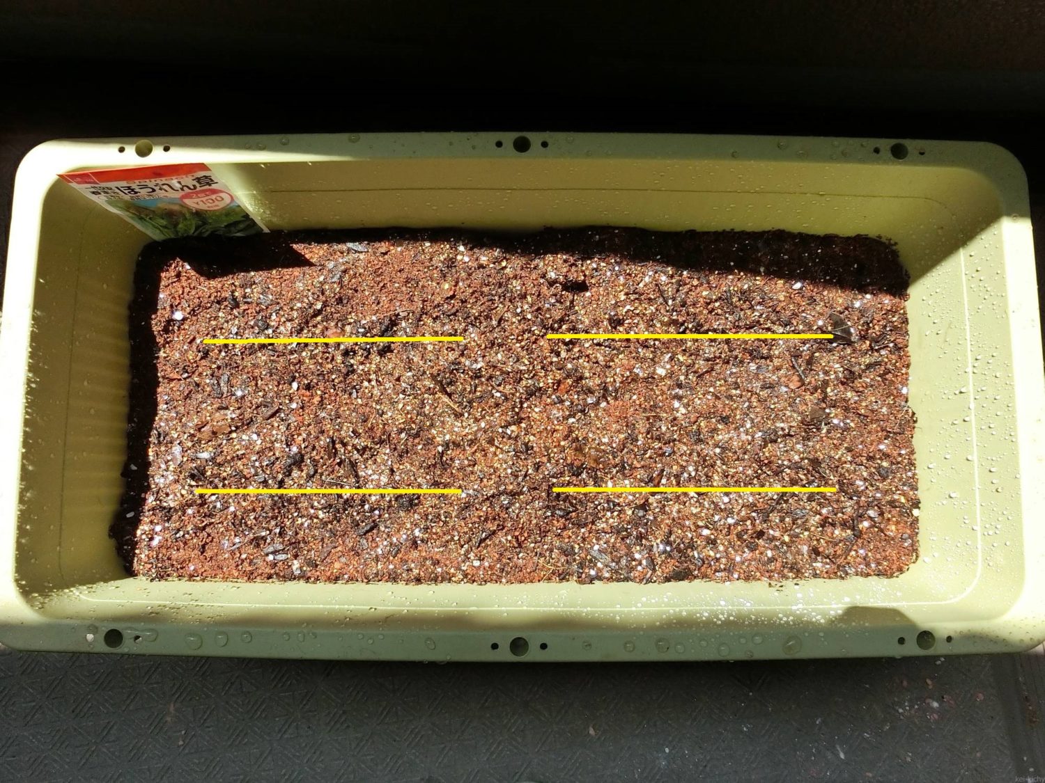 (間違ってドバっとまいてしまった場合は回収できるものは回収しますが、発芽後、間引きしますのでOKです) - 土をかけて少し押し付けてから水やりをする。